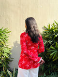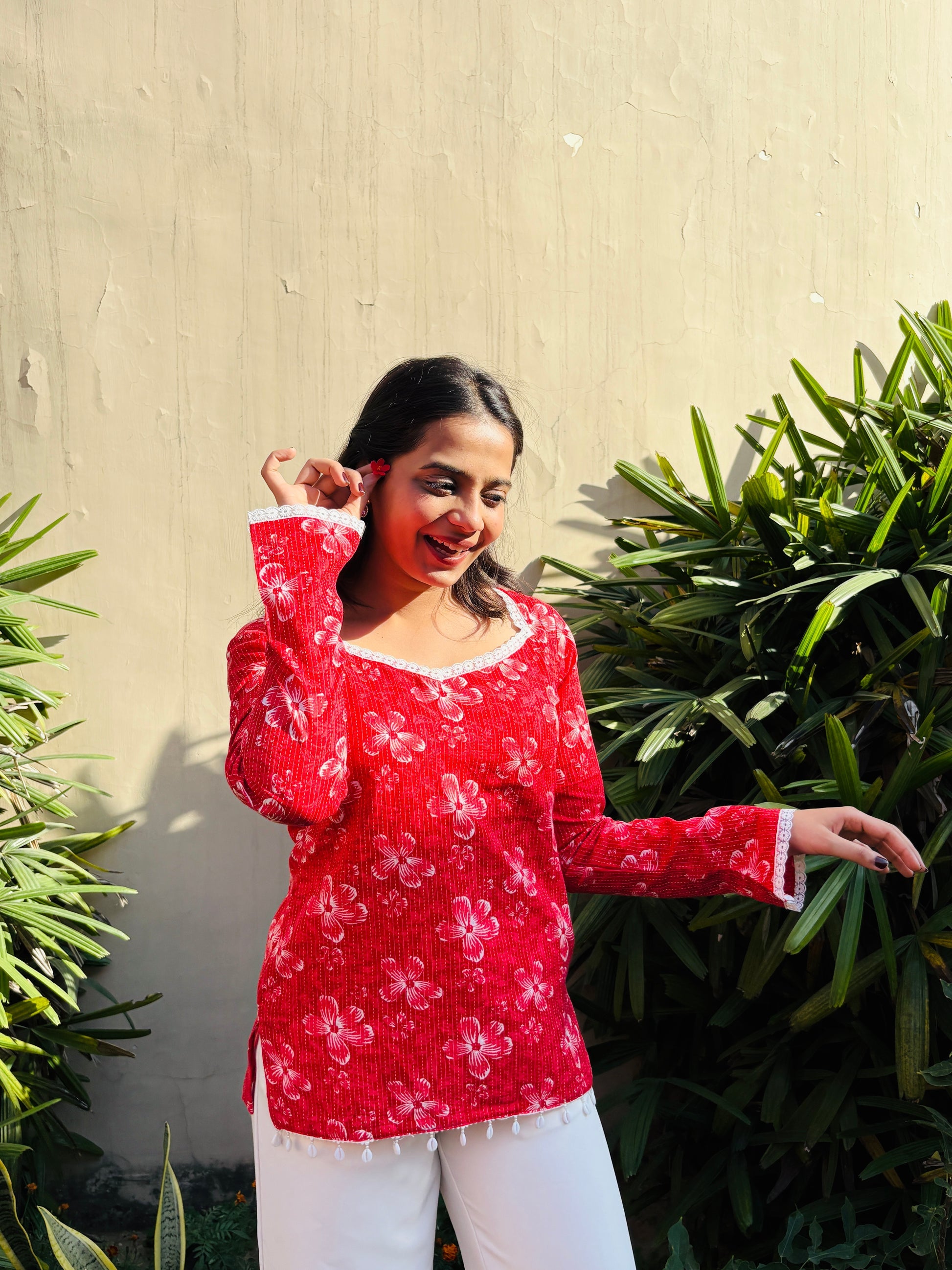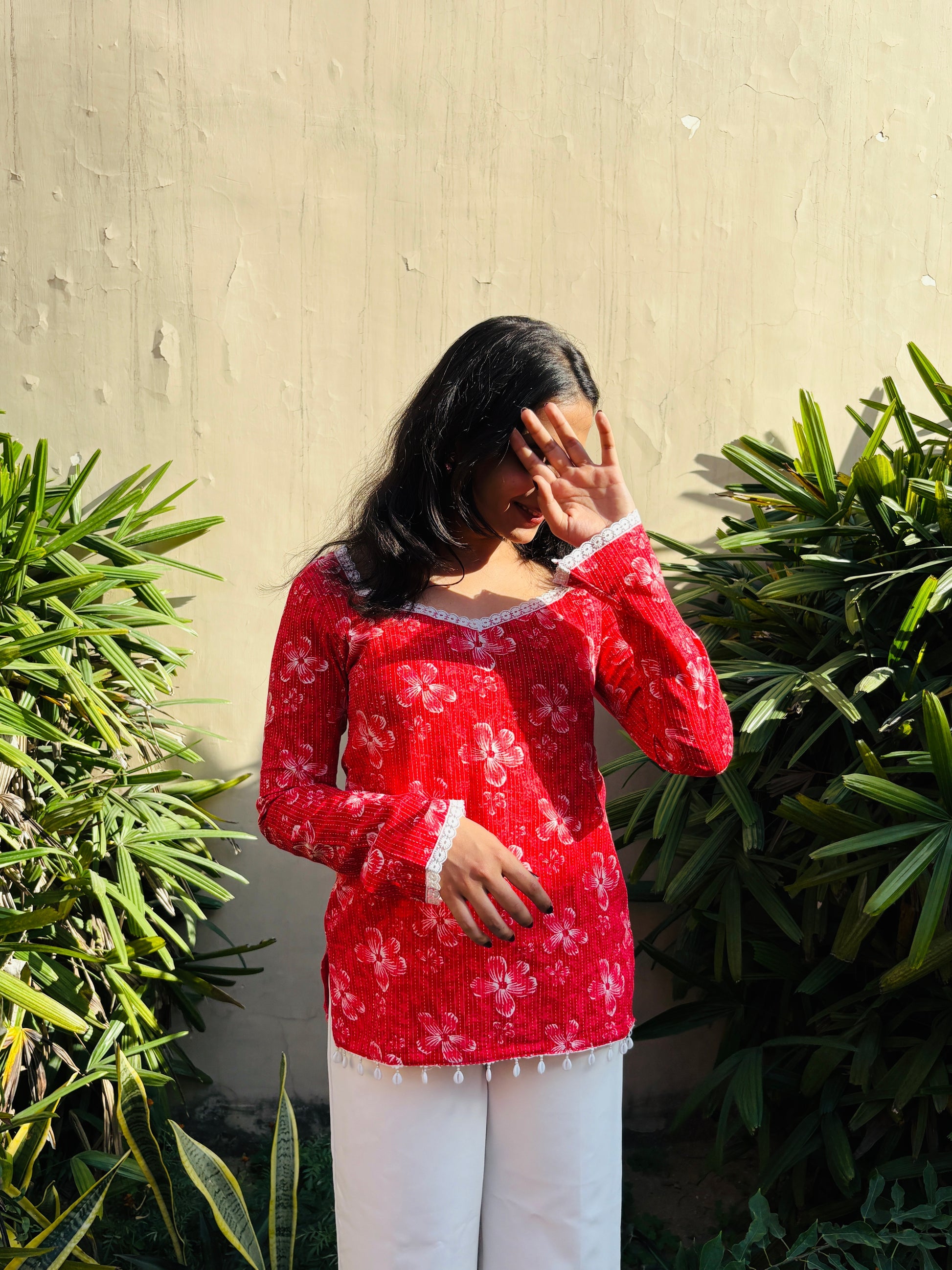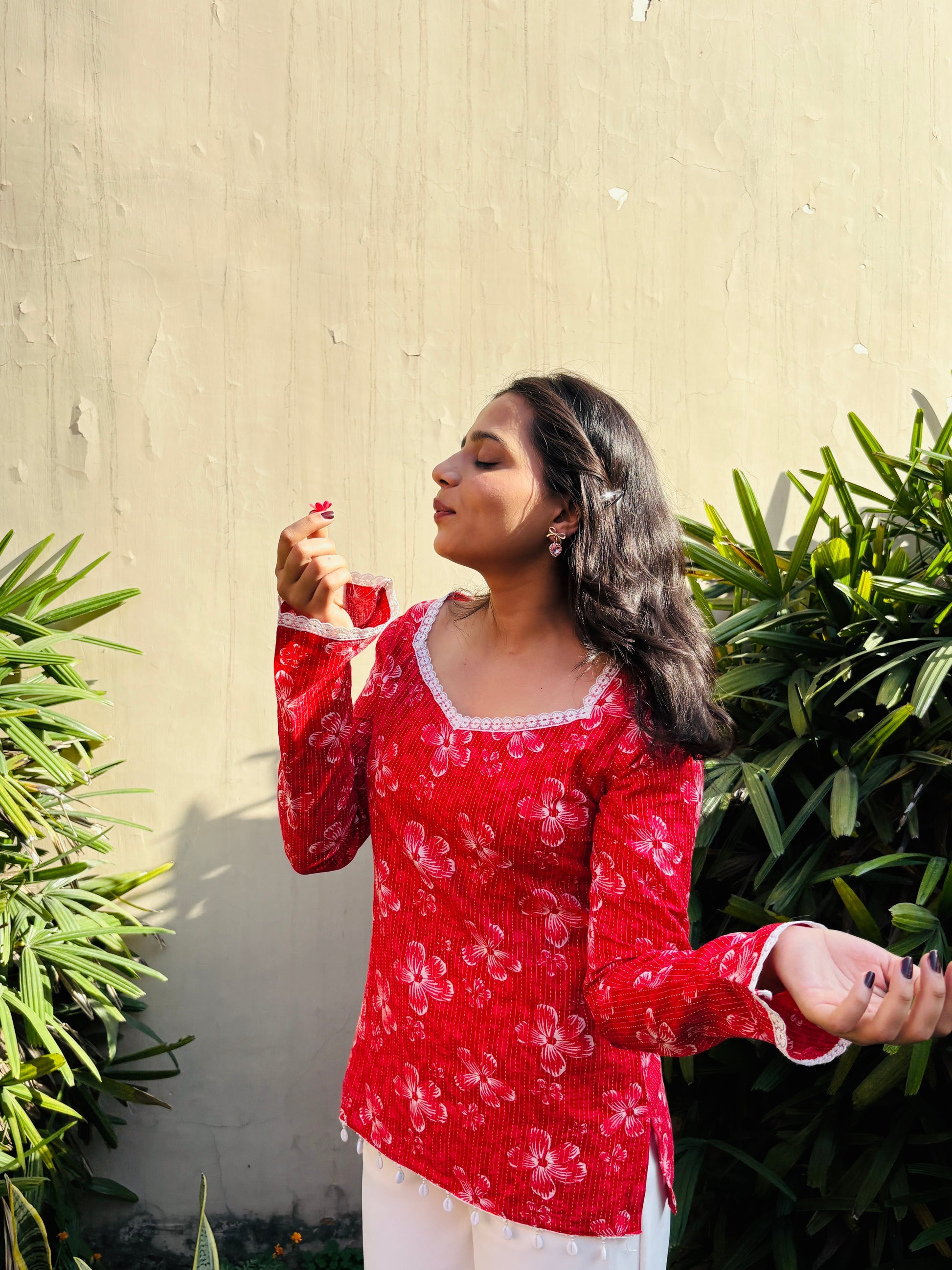 A timeless fusion of tradition and comfort, the cherry Kurti is crafted from soft, breathable cotton adorned with intricate handblock floral prints. The delicate shaqnq lace along the neckline and sleeves adds a subtle elegance, while the pearl-drop detailing on the hem lends a graceful finish. Designed for effortless styling, this kurti is perfect for casual outings, festive gatherings, or a breezy day out.