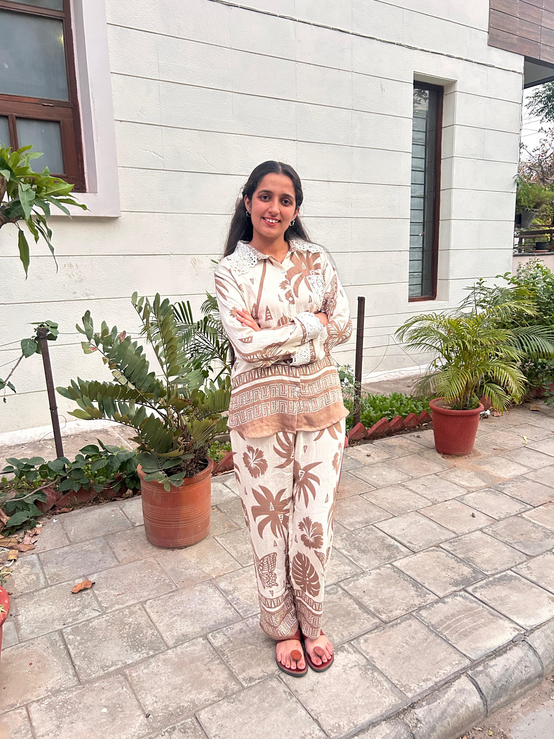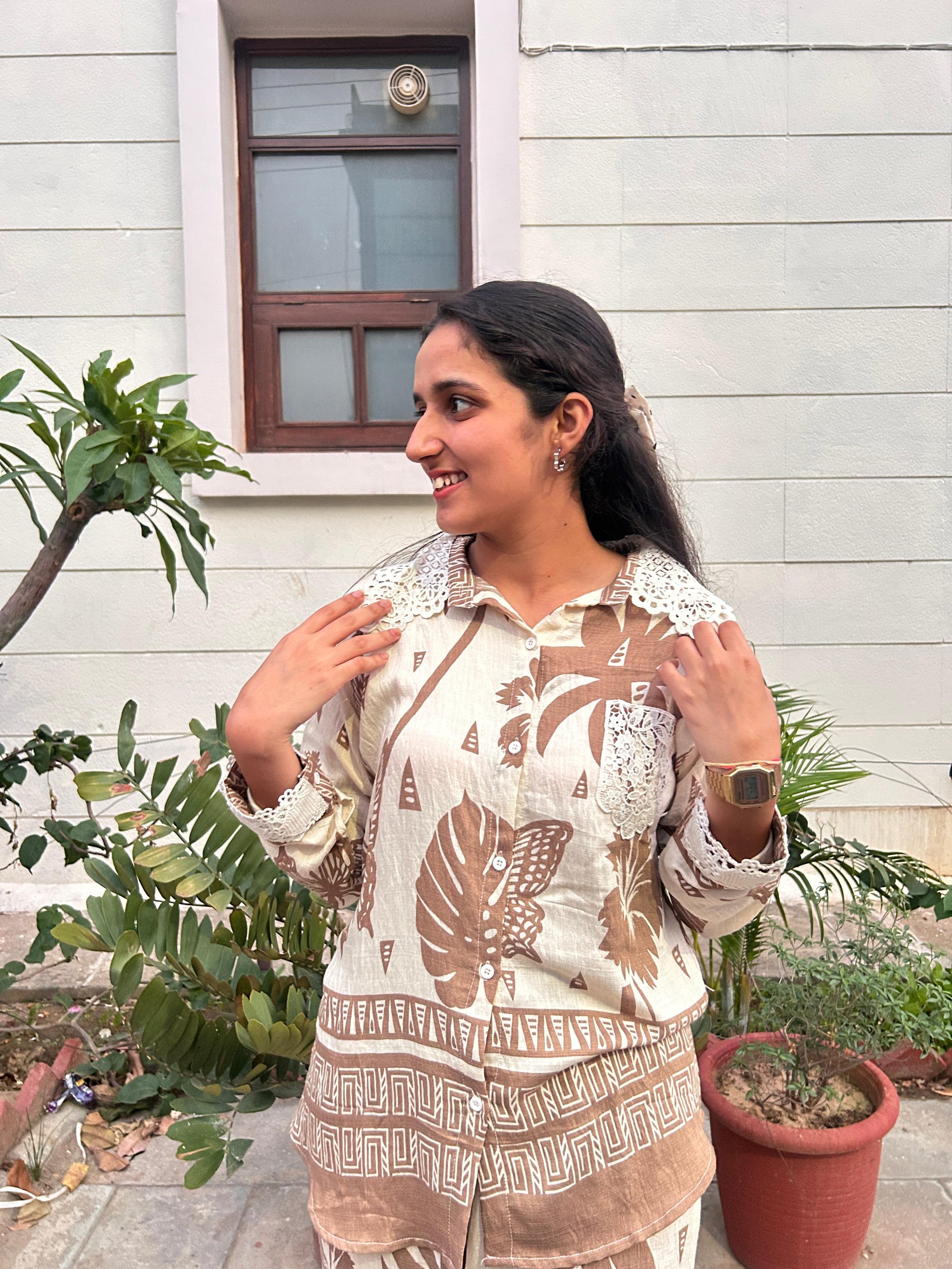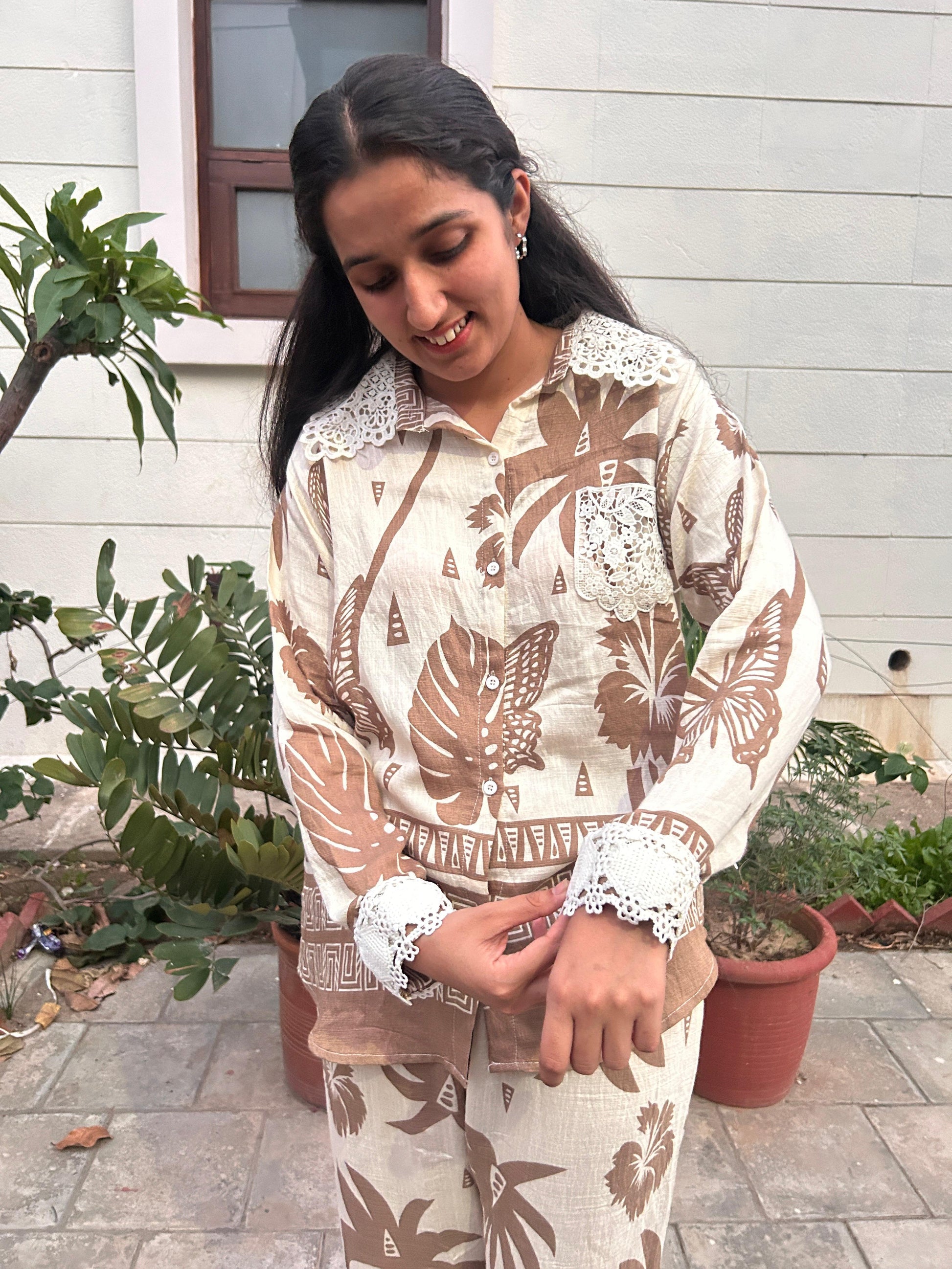 Step into laid-back luxury with our cocoa palm Cord Set. Featuring an earthy palette of warm beige and cocoa brown, this coordinated outfit is adorned with bold botanical and butterfly prints for a carefree, nature-inspired vibe. The soft, breathable fabric ensures all-day comfort, while delicate lace accents on the collar and cuffs add a charming, vintage touch. Perfect for relaxed outings or a casual chic statement, this set blends comfort and elegance effortlessly.
