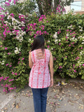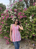 This is a vibrant and summery sleeveless cotton short kurti featuring a pink and white geometric tie-dye pattern. The kurti has a fitted silhouette with a flattering round neckline in front and a stylish criss-cross lace-up back, adding a trendy and youthful flair. it's perfect for casual outings, college wear, or a relaxed day in the city.