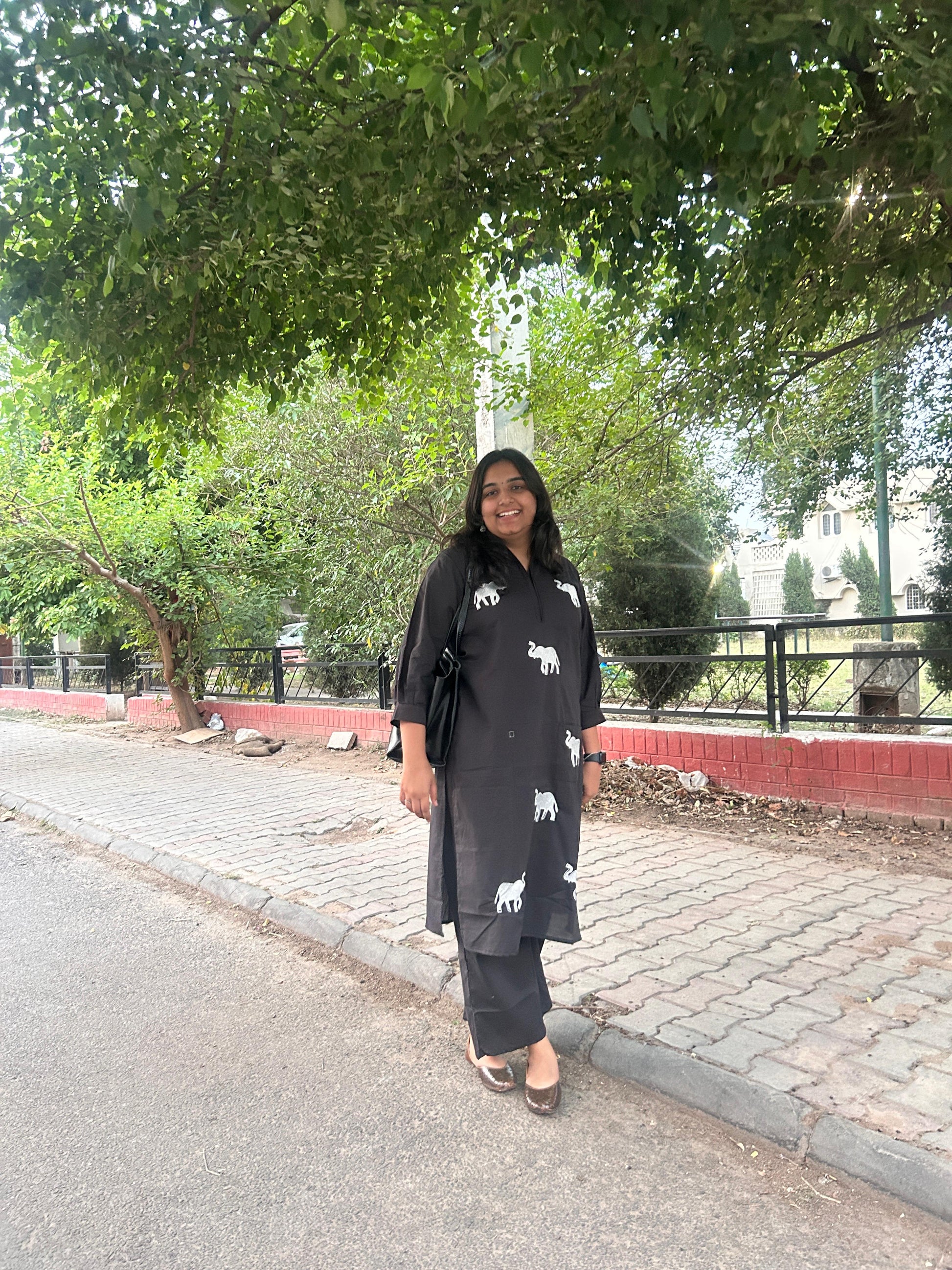 This cord set features a contemporary black kurta and pants combo. The kurta is designed in a straight-cut silhouette with a notch neckline and three-quarter sleeves, creating a clean and elegant look. A playful element is added with the white embroidered animal motifs—primarily elephants—scattered across the front, offering a unique and quirky charm. Paired with matching black straight pants, the outfit effortlessly balances traditional and modern aesthetics. making it perfect for casual outings or semi-formal gatherings