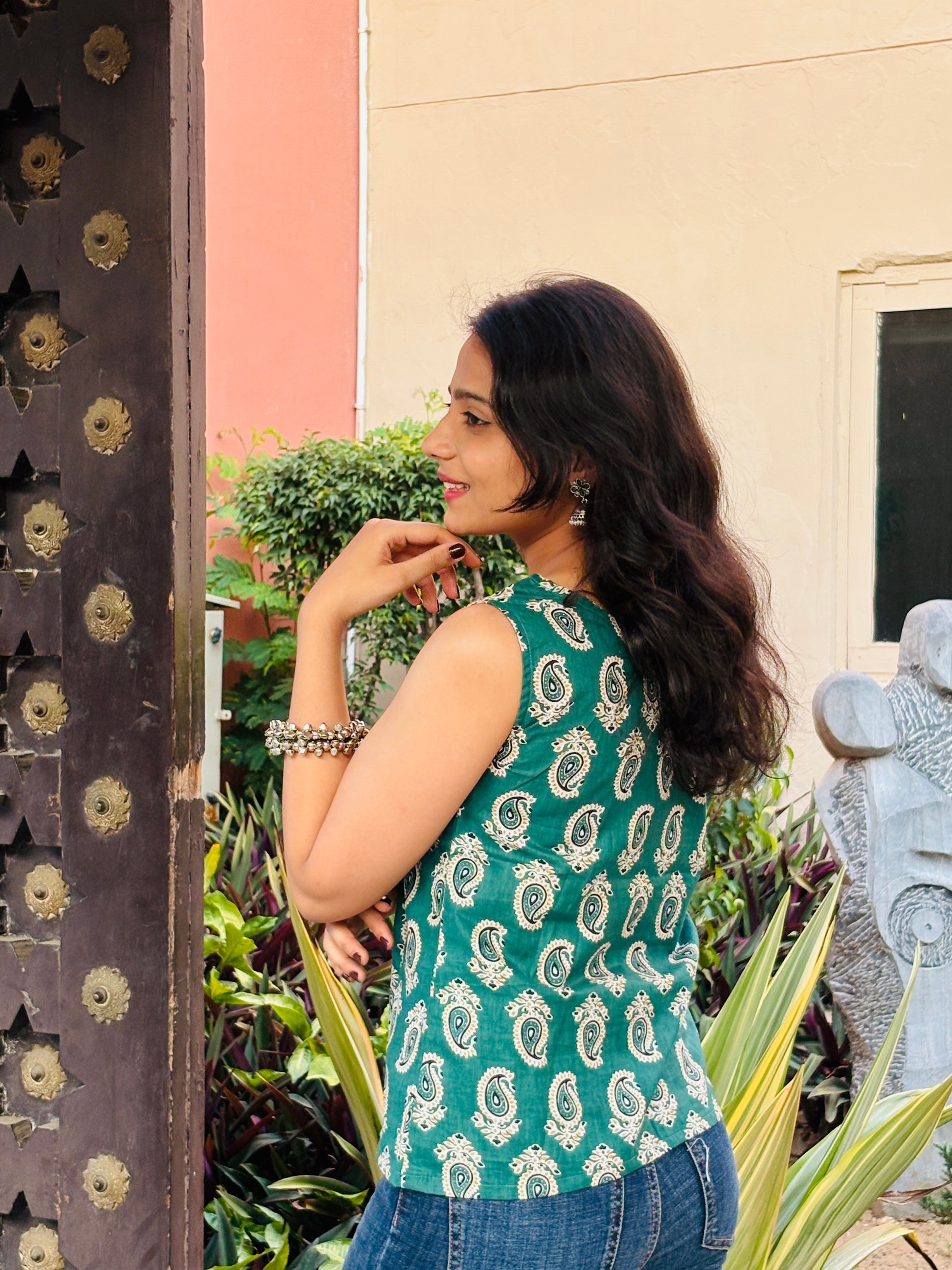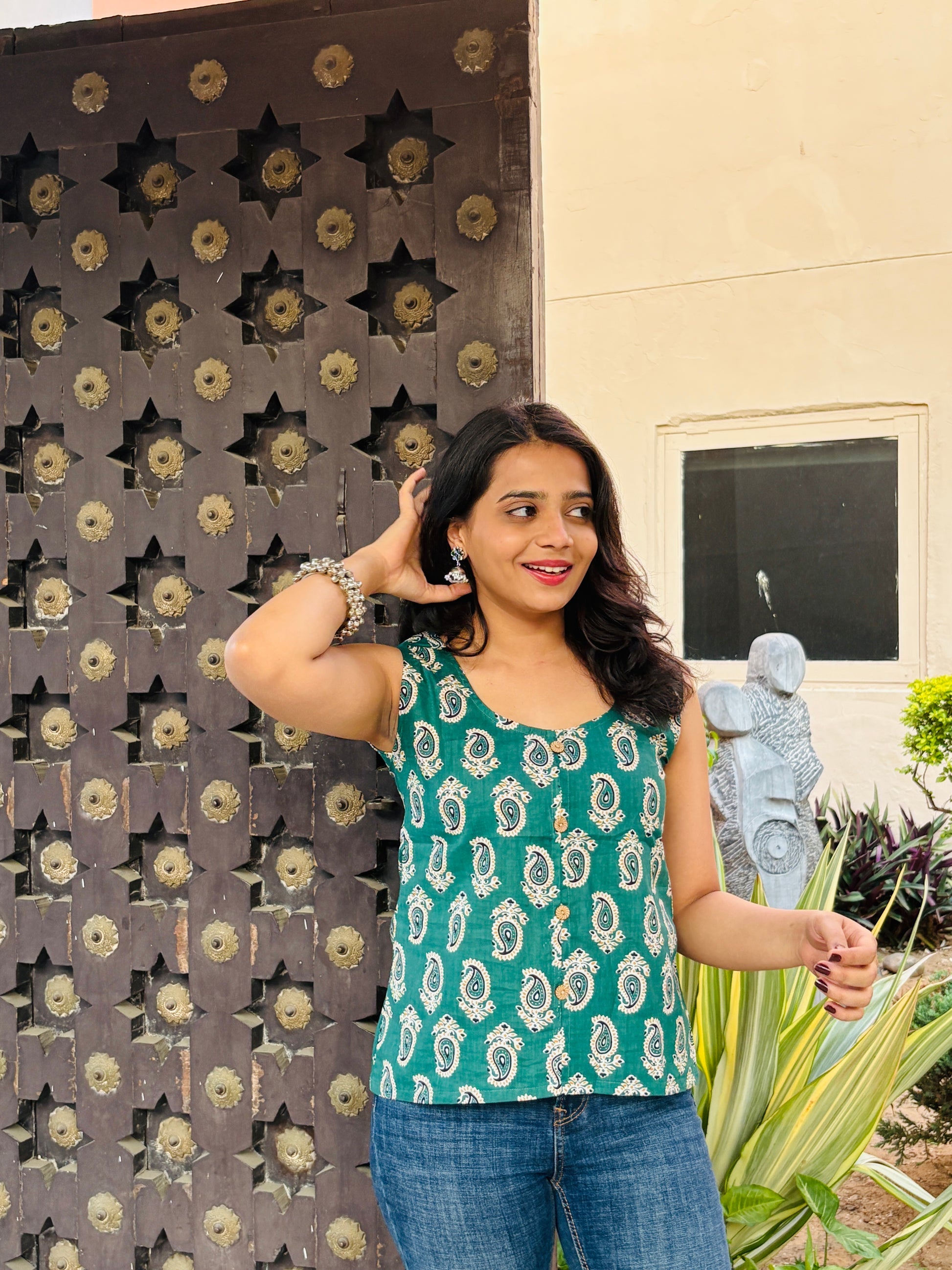 A timeless blend of elegance and comfort, this emerald-green paisley top is a wardrobe essential. The intricate handblock print and front button-down detail add a touch of heritage, while the soft cotton fabric keeps it breathable for all-day wear. Perfect with jeans or ethnic skirts, it's an effortless pick for any occasion.