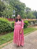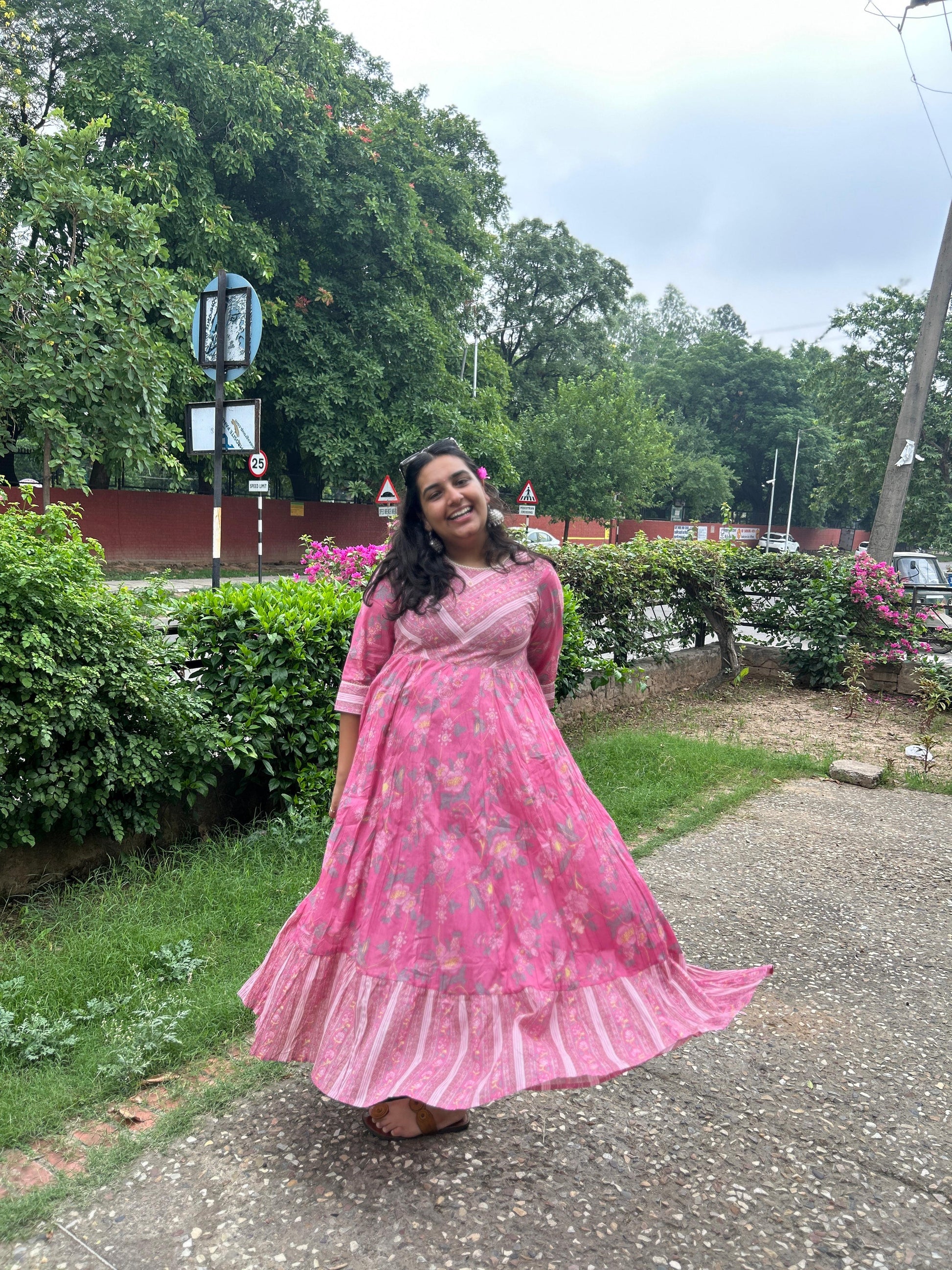 Radiate festive joy in the Gulaabi Noor Anarkali, a flowy silhouette drenched in vibrant shades of pink. This enchanting ensemble features a mix of floral and traditional block prints with intricate chevron pattern detailing on the yoke and sleeves. The gathered flare and soft cotton fabric offer comfort with a twirl-worthy charm, making it ideal for daytime celebrations, pujas, or festive brunches. The 3/4th sleeves and fitted bodice balance elegance with ease, while the tiered hem adds a dreamy finishing touch. Pair it with silver jhumkas and a bright smile to complete the look.