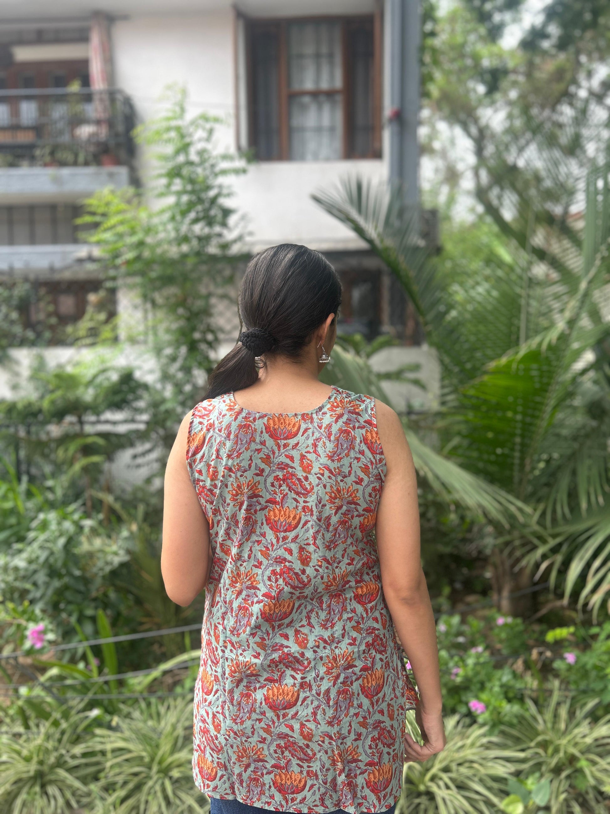 Step into effortless elegance with this beautifully crafted floral print kurti, perfect for both casual and semi-formal occasions. Made from soft, breathable cotton fabric, this kurti features a soothing pastel green base adorned with intricate handblock-style floral motifs in shades of red, rust, and muted lavender. The V-neckline adds a flattering touch, while the long flared sleeves lend a graceful silhouette. Pair it with jeans or palazzos for a stylish and comfortable look that transitions seamlessly from day to evening.