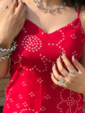 A bold blend of sass and sanskaar — this deep red Bandhej V- neck strappy top crackles with desi drama. The dotted tie-dye print gives it a rooted, traditional soul, while the cut adds just the right touch of heat. Pair it with jhumkas, bangles, or sunglasses — and let the laal bijli strike.