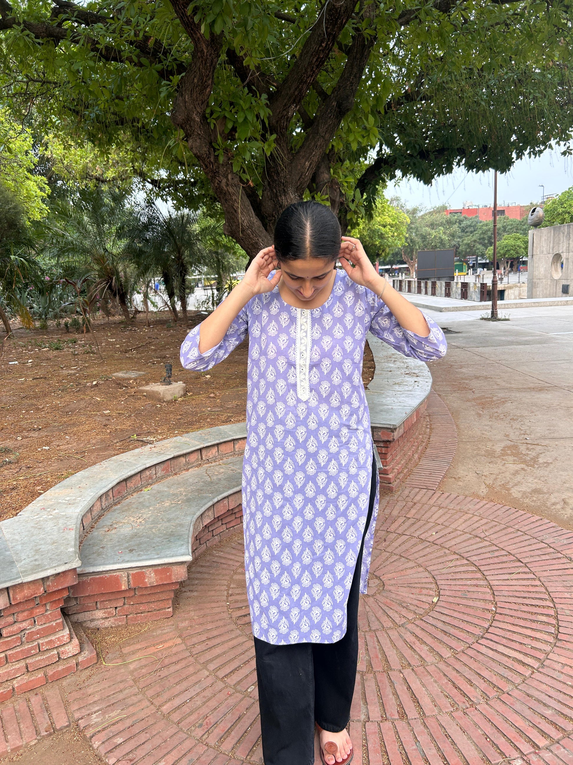 Simple, serene, and stylish – the Lavender Bloom Straight Kurti is a perfect blend of everyday comfort and timeless grace. Featuring a soothing lavender hue adorned with delicate white floral block prints, this kurti is crafted in breathable cotton for all-day ease. The round neckline with a front button placket and 3/4th sleeves offers a classic silhouette, while the side slits ensure free movement and flair. Paired best with black pants, palazzos, or leggings, it's ideal for college, office, or casual outings with a subtle desi charm.
