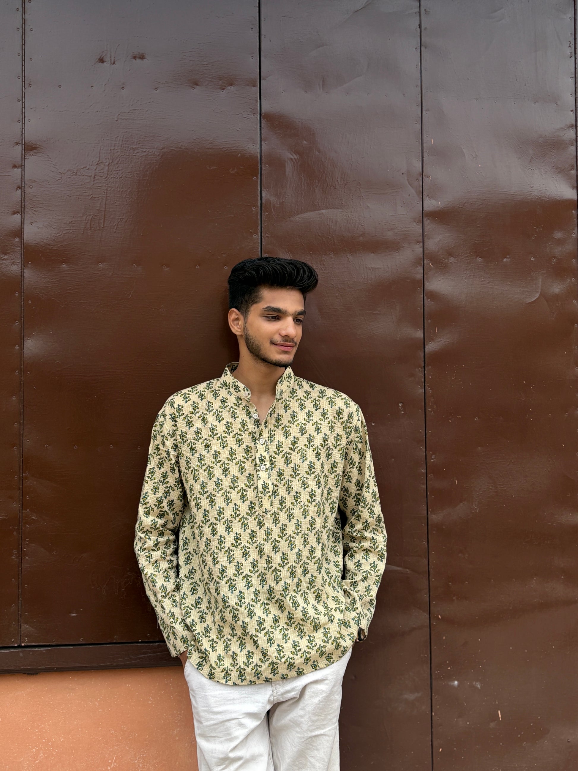 Step into effortless style with this cream-colored short kurta — a timeless piece that blends simplicity with a strong desi flair. The soft, breathable fabric keeps you cool and comfortable all day, while the soothing cream shade adds a touch of calm elegance. Designed for easygoing occasions, family gatherings, or even a casual day out, this kurta pairs perfectly with jeans, cotton pants, or even a dhoti for a more rooted look. The minimal detailing, relaxed fit, and traditional neckline make it a go-to for men who appreciate ethnic wear with a modern, everyday twist.