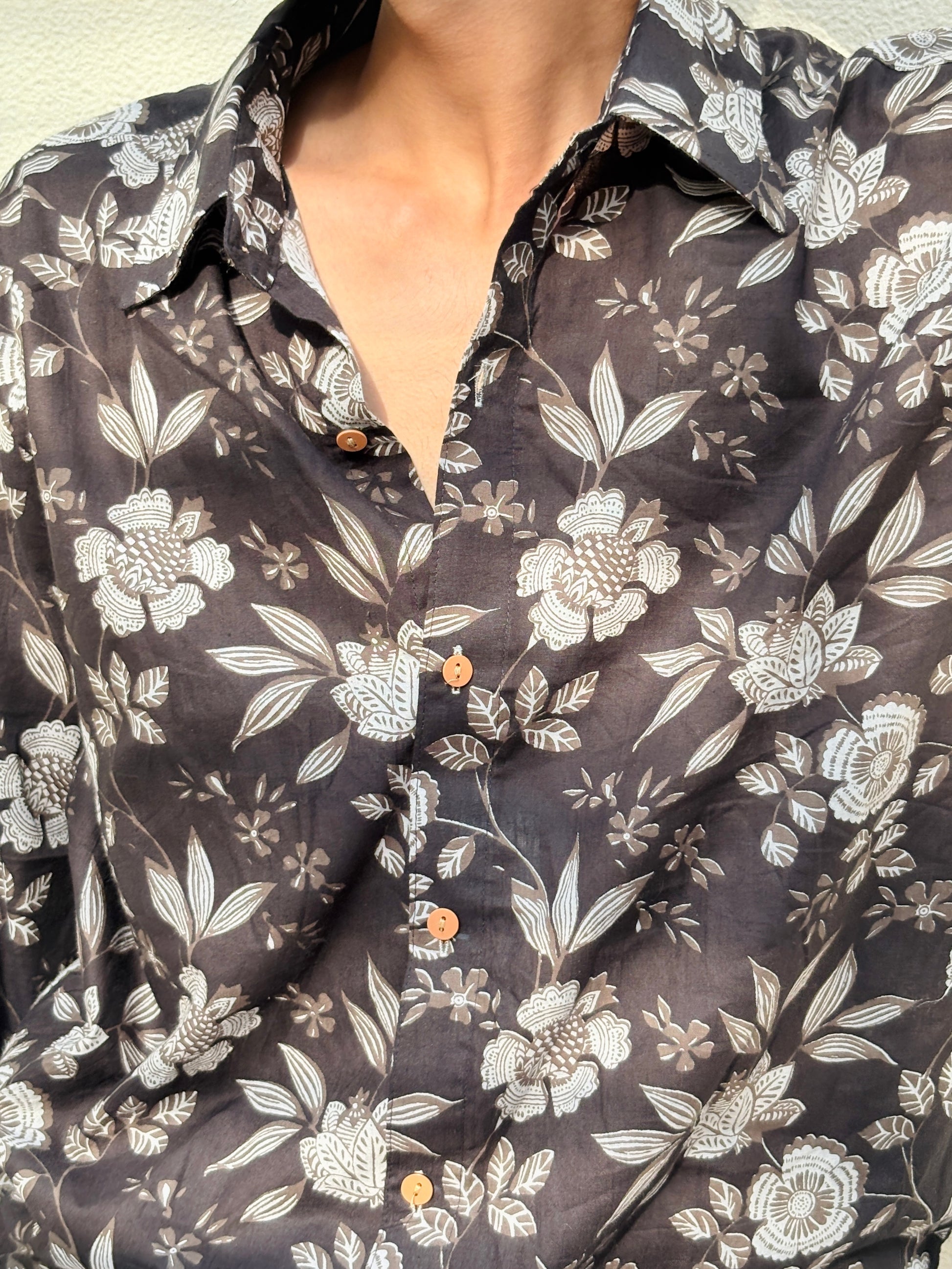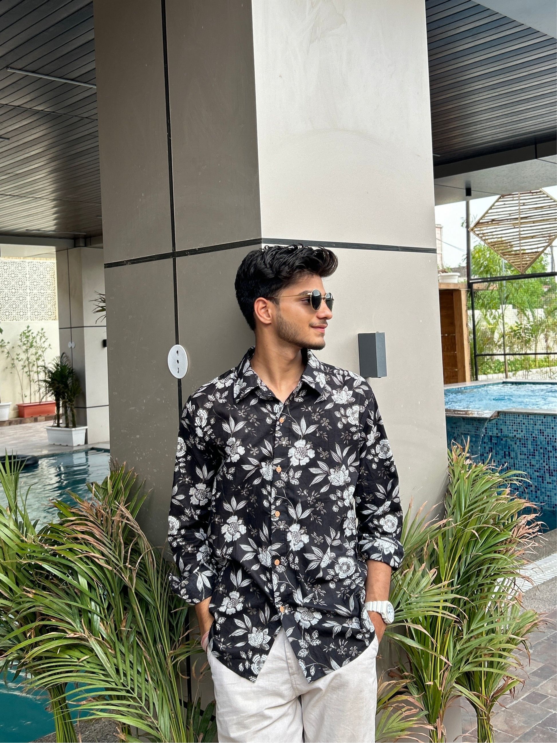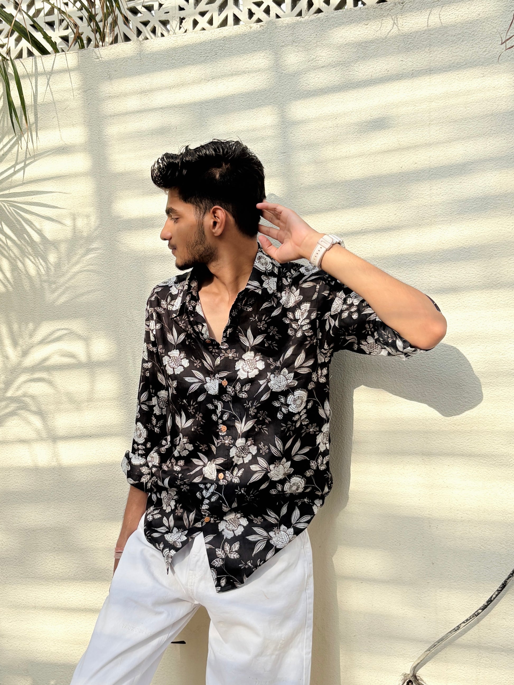 Dark, moody and undeniably striking.Bold meets graceful in this black shirt adorned with delicate white floral prints. The rich black base adds depth and sophistication, while the soft white florals bring a touch of freshness and charm. Made from breathable, comfortable fabric, this shirt is perfect for both casual evenings and semi-formal occasions. Pair it with light denims or neutral trousers to let the print stand out and make a quiet yet confident style statement.