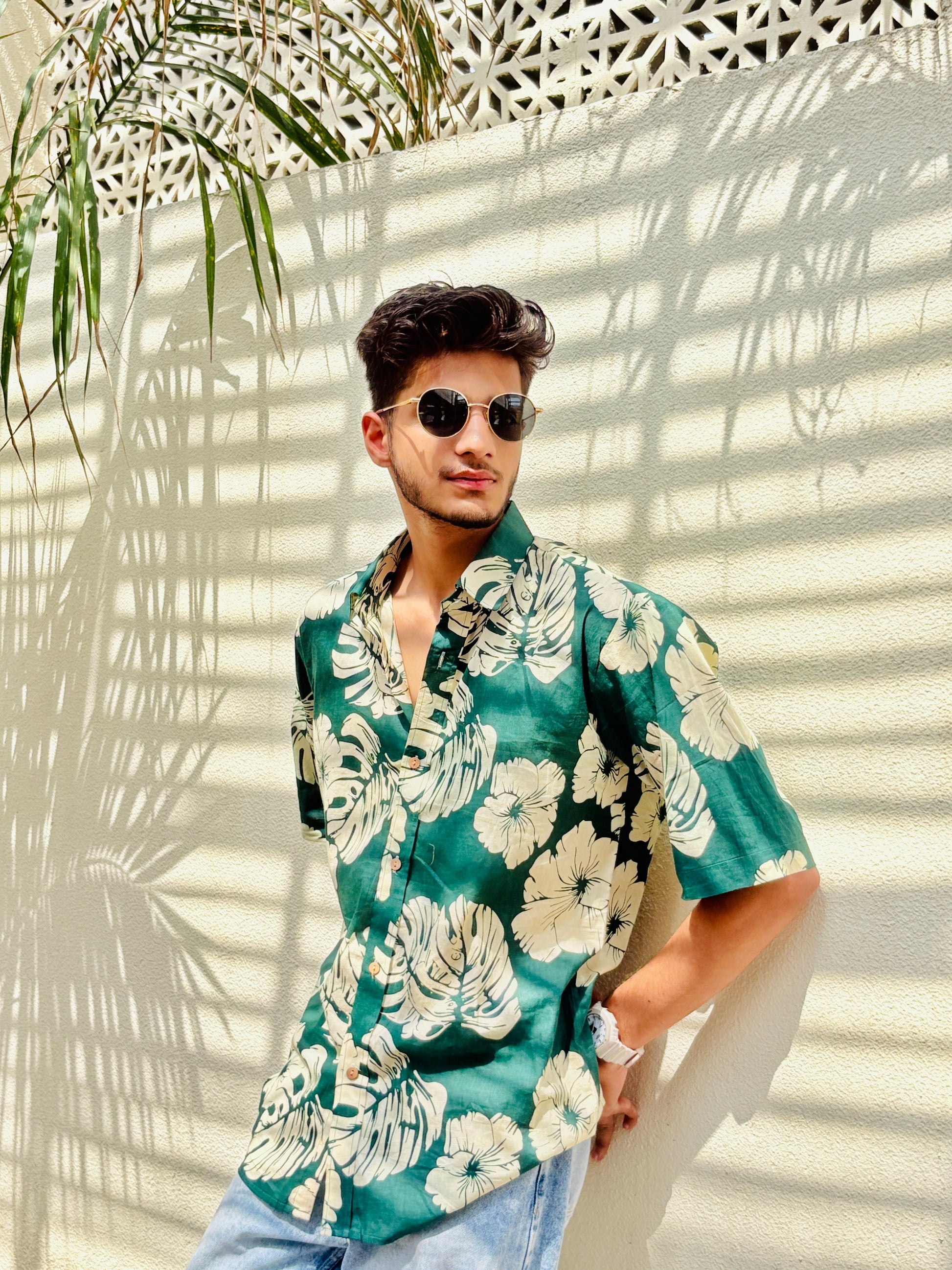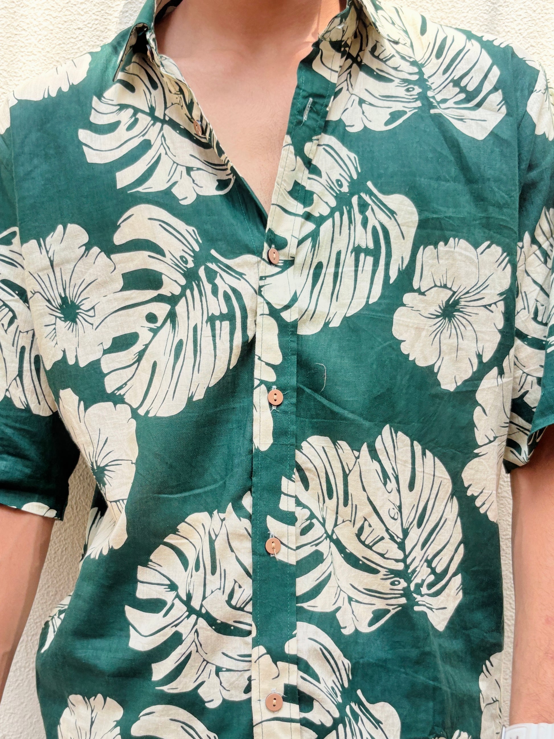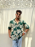Bring nature into your style with this vibrant green shirt featuring bold, oversized leaf prints. The lively pattern adds a tropical, statement-making touch, while the breathable fabric keeps things easy and comfortable. Perfect for vacations, brunches, or a casual day out, this shirt pairs well with light trousers or shorts for a laid-back, confident look that stands out with natural flair.