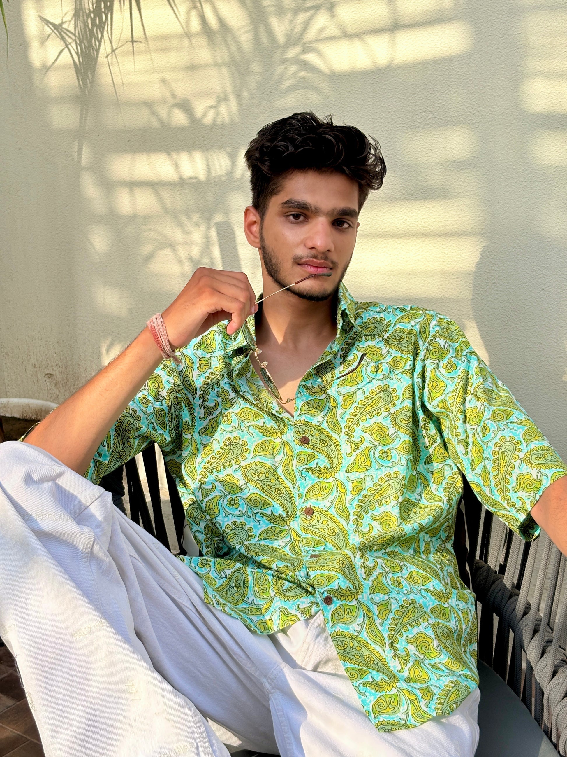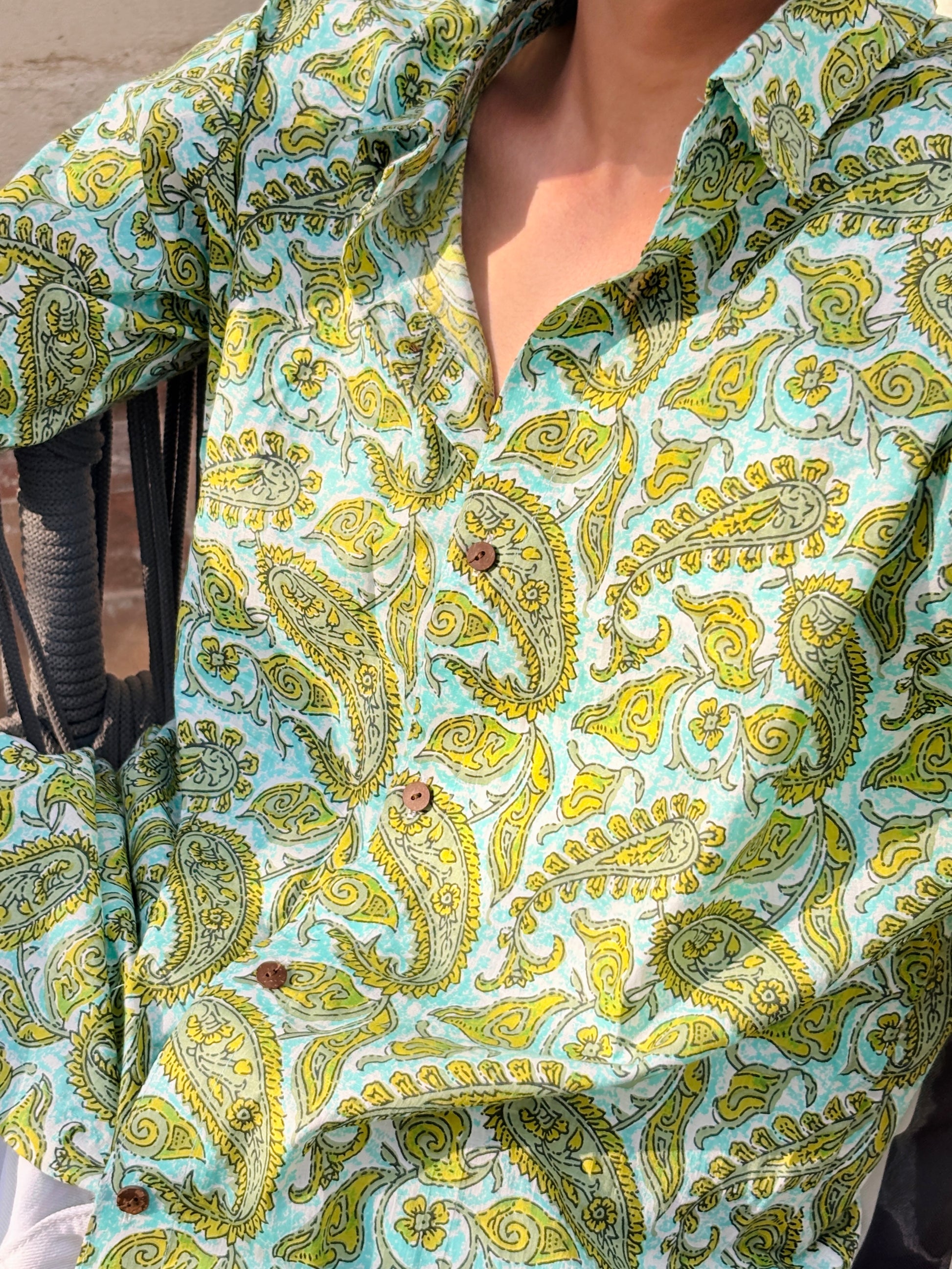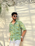 The Taraang is a nostalgic floral revival. The print nods to vintage buti patterns, while the tailored fit brings it into now. Breezy, versatile, and soaked in stories, this shirt whispers instead of shouts.Rooted in tradition, this green and blue printed shirt features elegant booti motifs that add a touch of timeless charm. The rich blend of cool tones gives it a refreshing yet regal feel, while the fine detailing of the prints reflects classic Indian craftsmanship. Made from soft, breathable fabric, it’s perfect for casual gatherings, cultural events, or everyday wear with a traditional twist. Pair it with neutral bottoms for a balanced, graceful look.