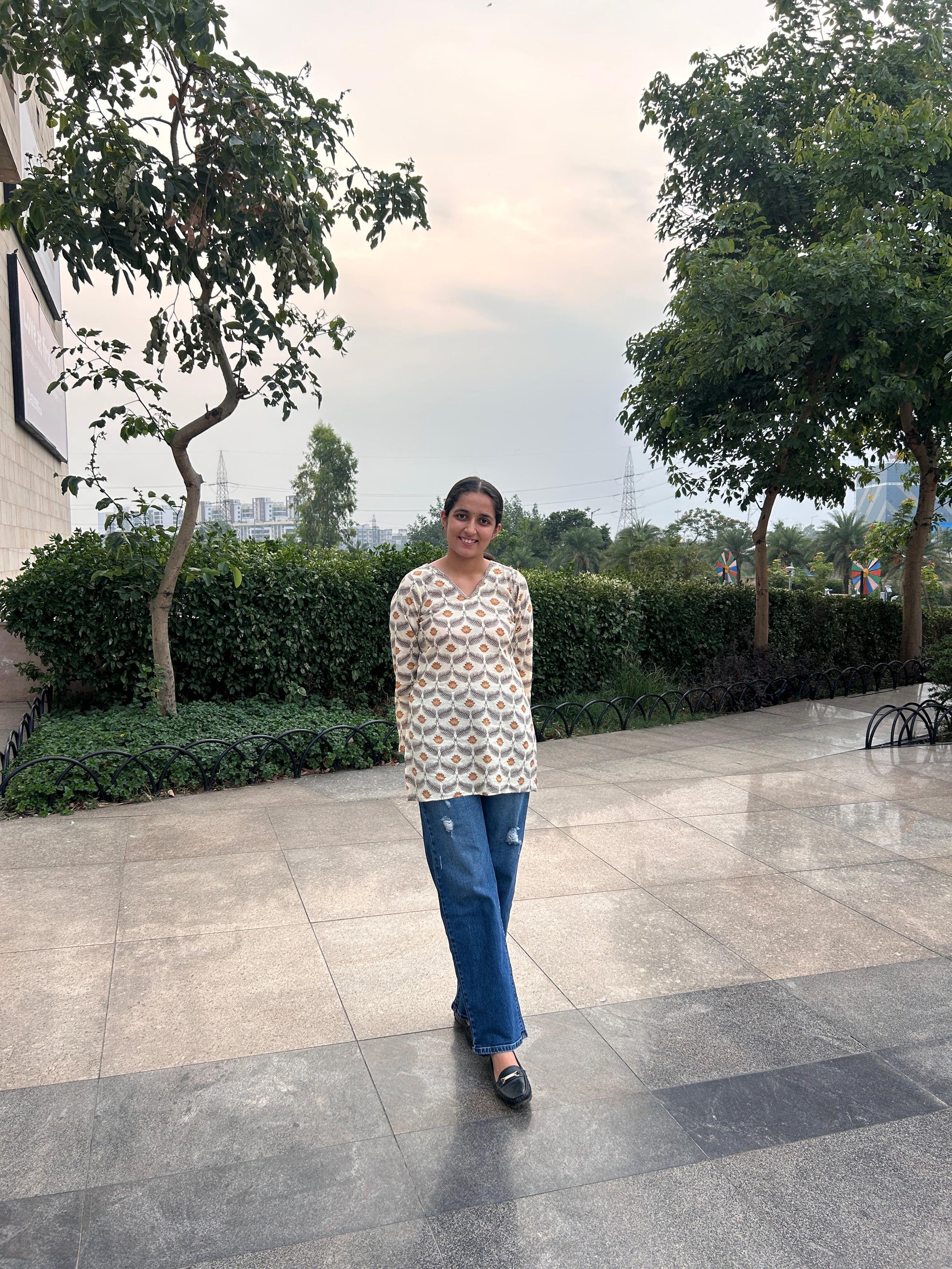 Effortlessly stylish and rooted in tradition, the Rustica Block Print Kurti is a wardrobe staple for everyday elegance. Made from soft, breathable cotton, this V-neck kurti features a subtle A-line silhouette and earthy hand-block floral motifs in warm rust and brown tones. The full sleeves and classic fit make it ideal for pairing with denim, palazzos, or leggings. Whether you're heading out for a casual day or a cozy evening stroll, this kurti blends comfort with understated charm. Add jhumkas or a watch to elevate the look.