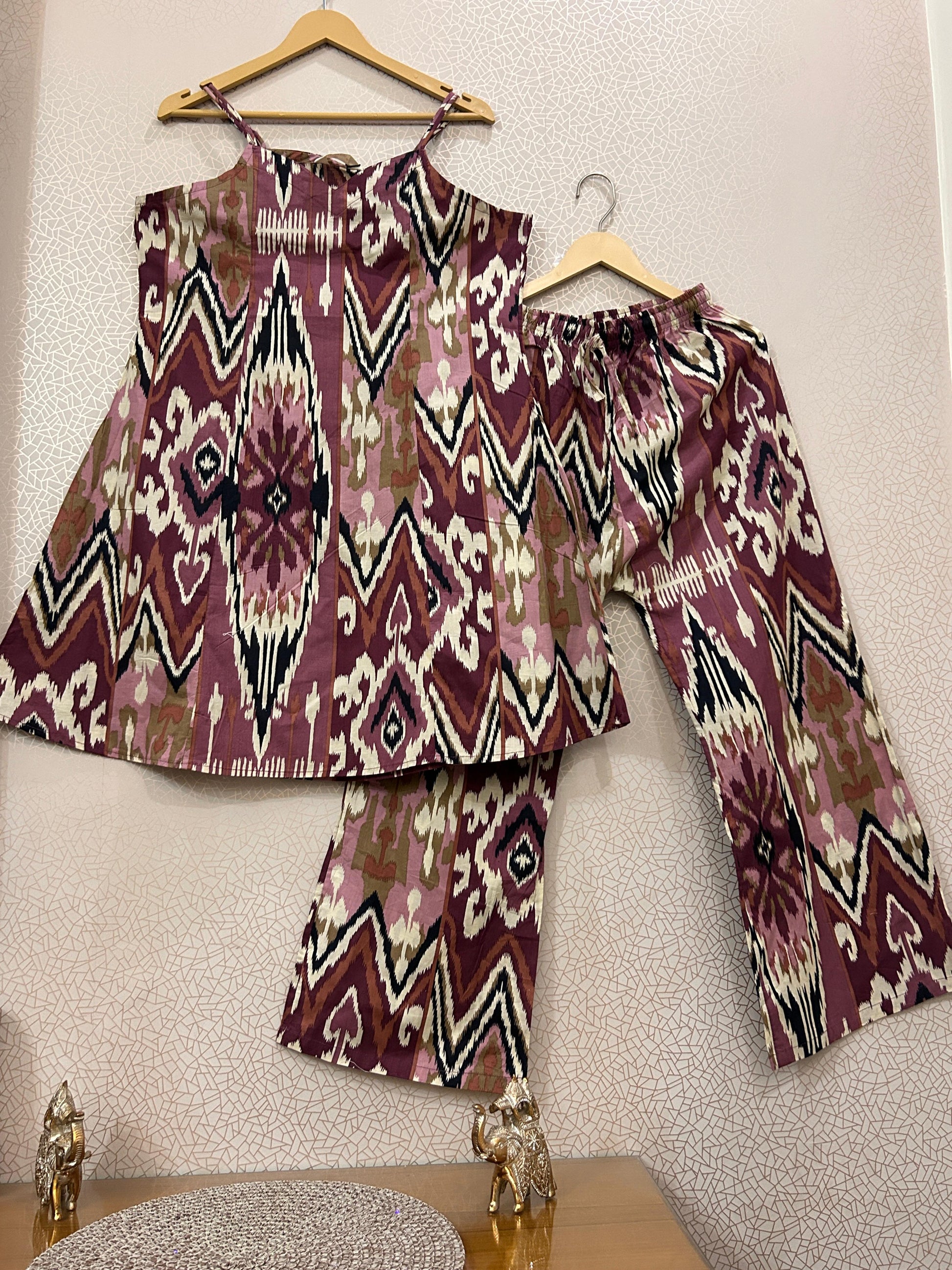 Step into effortless elegance with our Boho Bloom co-ord set, featuring a rich tribal-inspired ikat print in earthy maroon, olive, and cream tones. The sleeveless flared kurti-style top adds a touch of breezy charm, perfectly complemented by wide-leg pants with a relaxed fit and drawstring waist. Crafted from breathable fabric, this ensemble is your go-to for stylish comfort—whether you're lounging at home or heading out for a casual day.